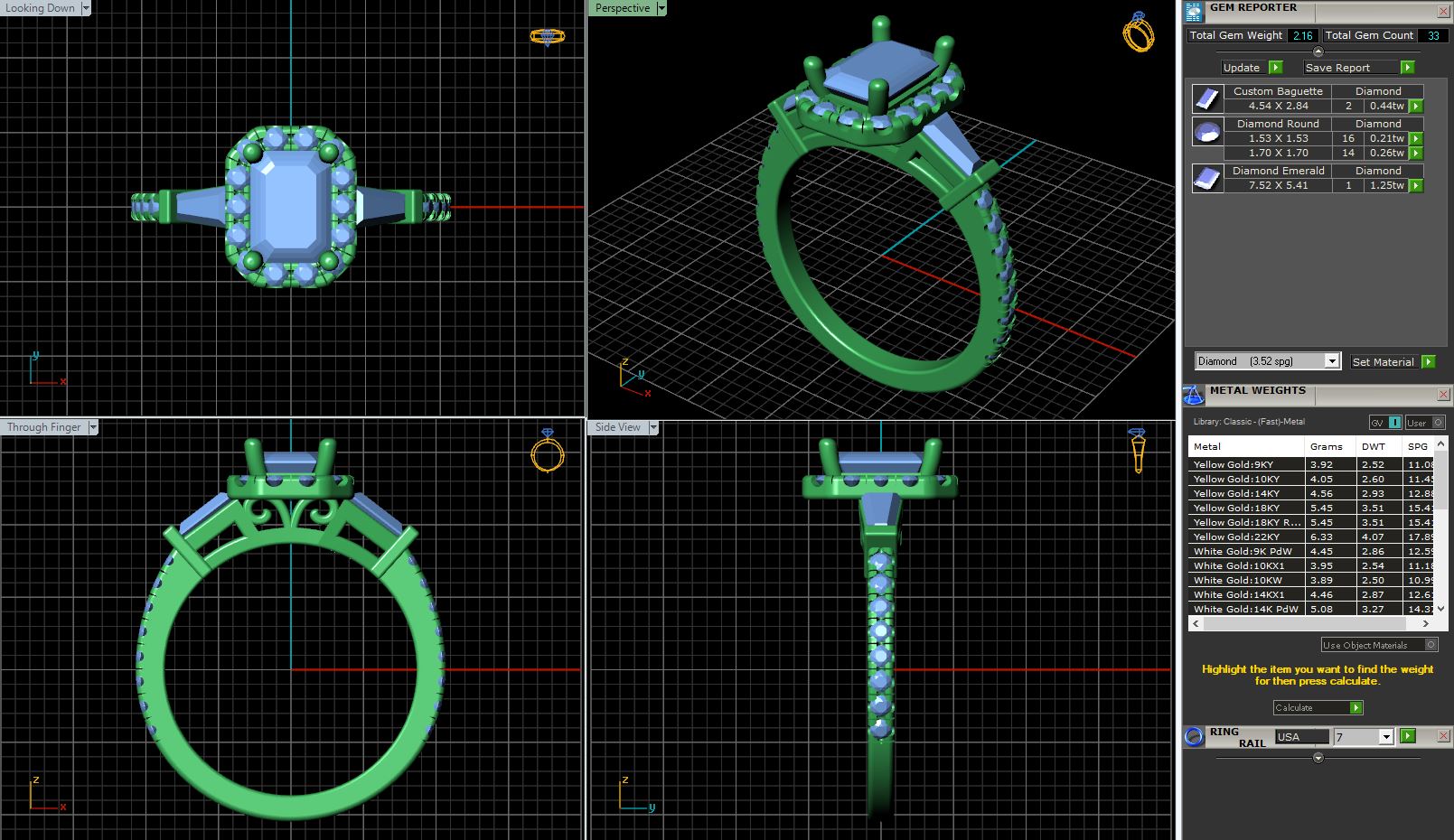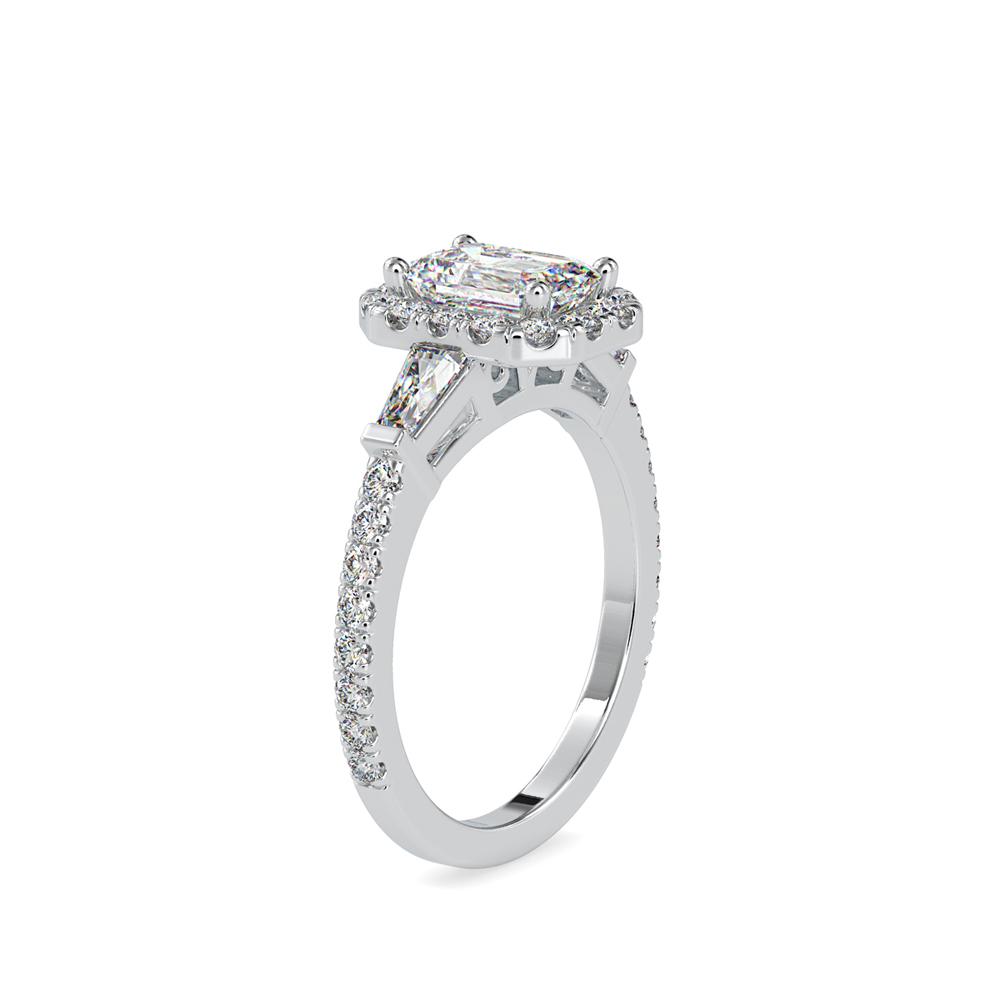 A center emerald shape diamond is bloomed by a hollow and accented with straight cut baguettes and diamond set shoulders.